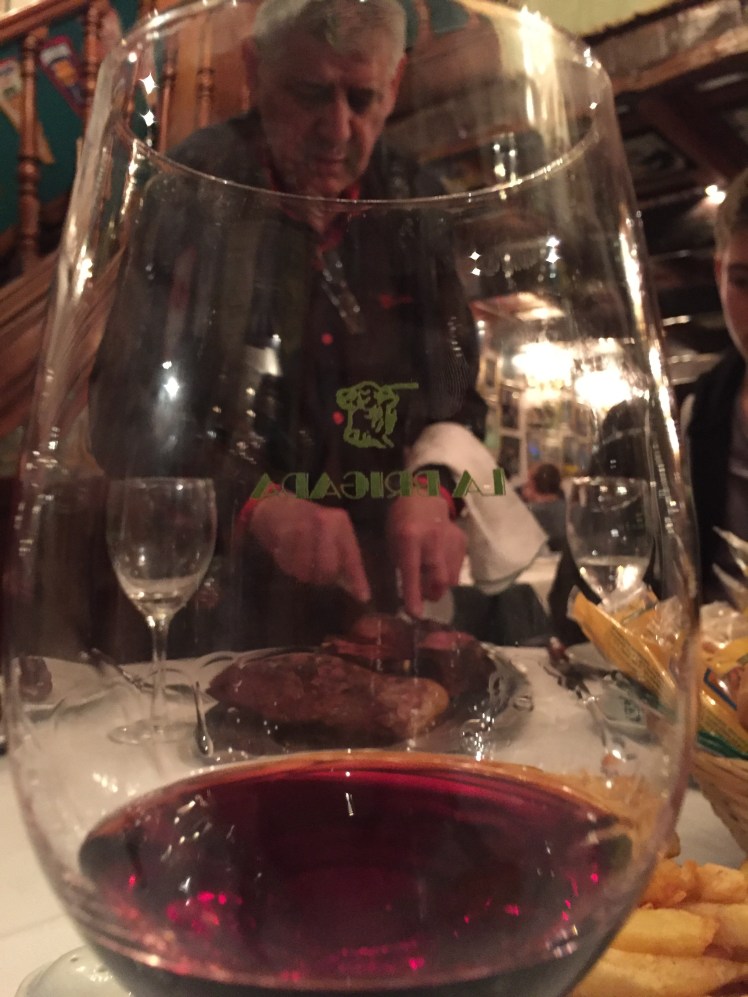 Mais place à l’acteur principal: la viande! Il est d’ailleurs de bon ton de ne point commander de légumes d’accompagnement me glisse ma cousine. Nous prenons tout de même une très bonne salade de roquette au parmesan (ceci pour conserver un teint frais). L’argentin étant fier, le serveur s’emploie à découper la viande à la cuillère pour démontrer la tendreté de la barbaque. Je m’enfile une rasade de Malbec afin de parfaire ce moment magique. Démonstration: