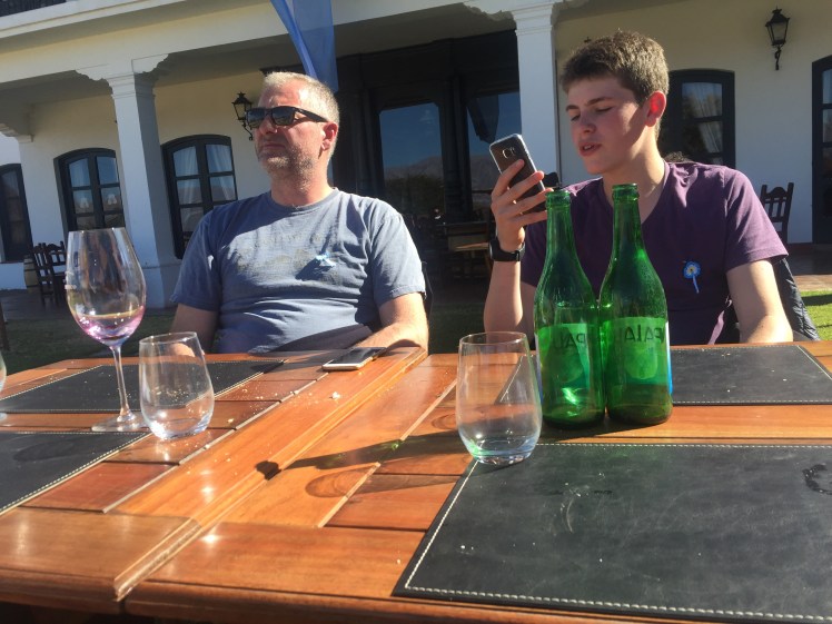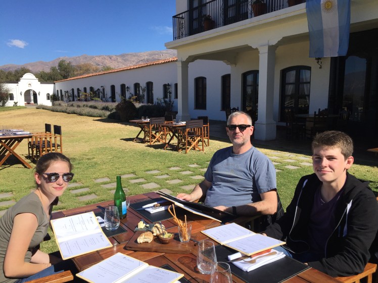 Today Argentina celebrated its 200 years of independence. We expected fanfare in the main square and parades, but everything was quiet. We rented bicycles and rode up the famous route 40. I don’t think I have ever had more spectacular scenery for a bike ride. We then went to the Esteca bodega, Patios Cafayate, for a highly civilized lunch in a Spanish hacienda built in the 1800s. We ate under a hot Argentinian sun in the manicured garden next to the pool. Probably the best bife de lomo (steak) we have had yet!