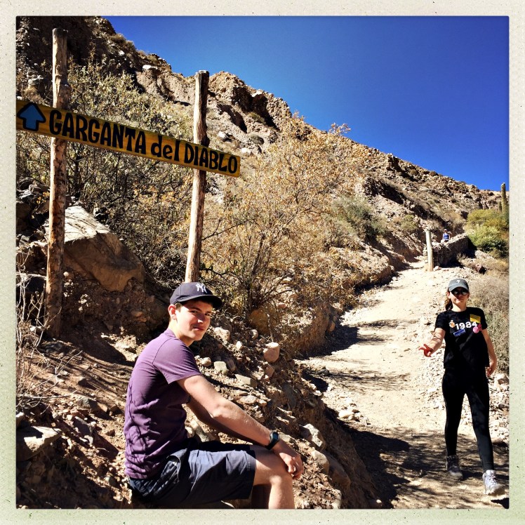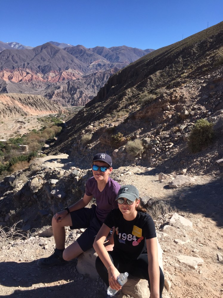 Sasha’s birthday turned out to be quite a busy day! After a surprise birthday cake for breakfast from the hotel (unclear whether birthday cake at the start of the day is the norm here, or if knowing we were going to be out for dinner, the hotel got a jump on the festivities), we went for a long trek in the mountains above the town of Tilcara up to the Garganta del Diablo and beyond up to 3,000 meters.