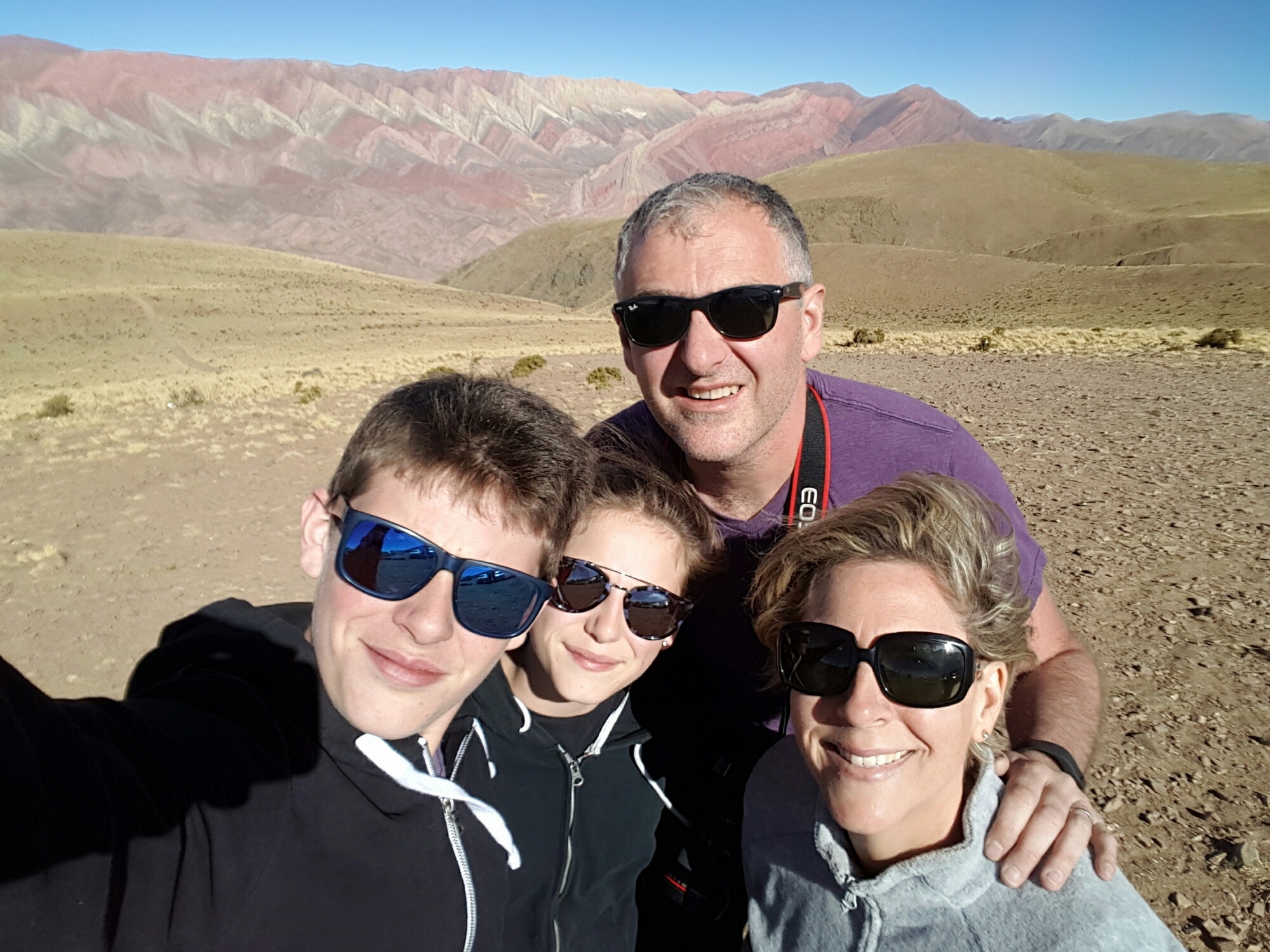 We decided that we really could not leave the Jujuy region without going to see the 14 colored mountains which appeared to be just a quick jaunt after Humahuaca. Well, the 25km were actually a winding, rocky, steep, dirt (read « dust ») road. It took us over an hour to access the vantage point, but once there, we did not regret it for an instant. The view from 4,200 meters was simply breathtaking…