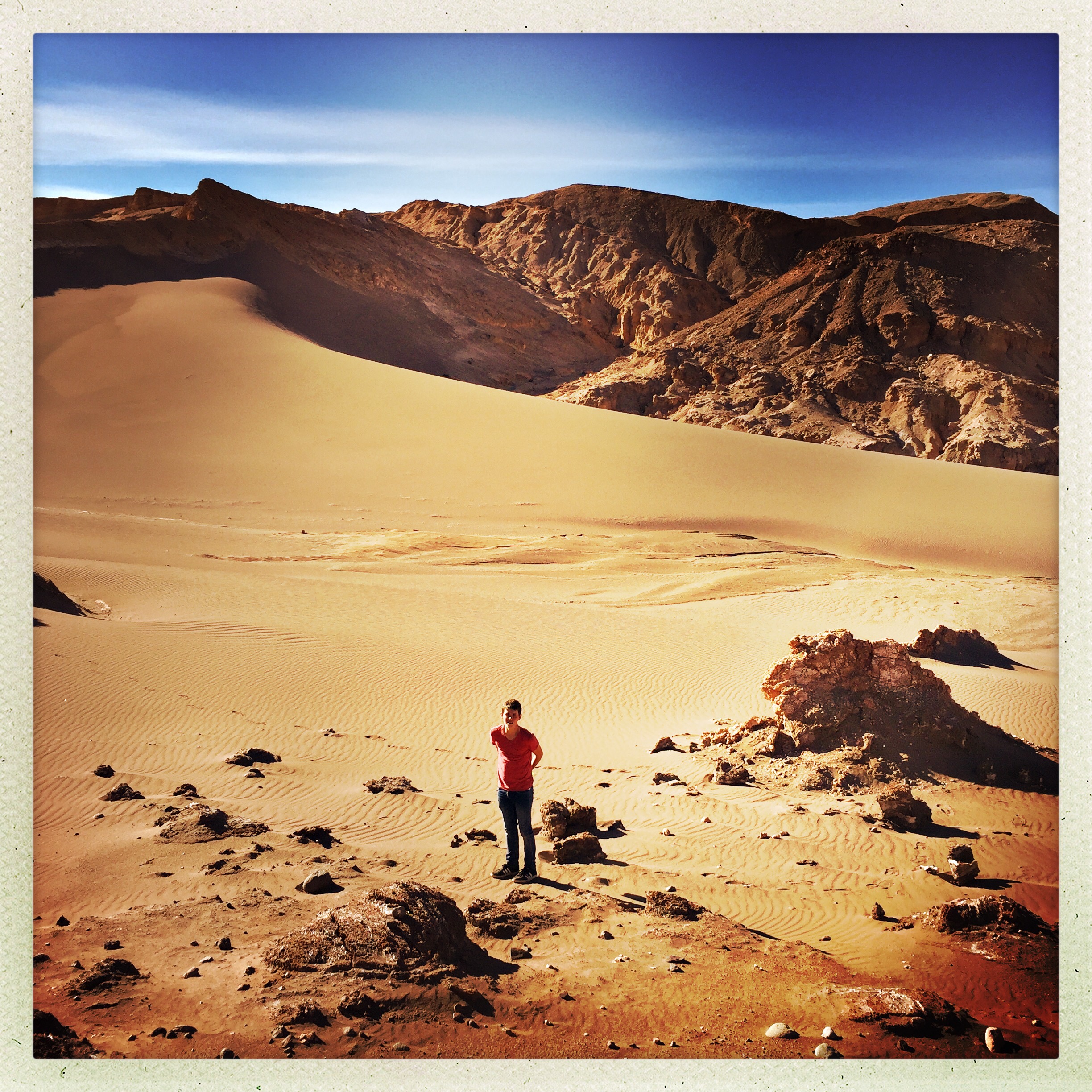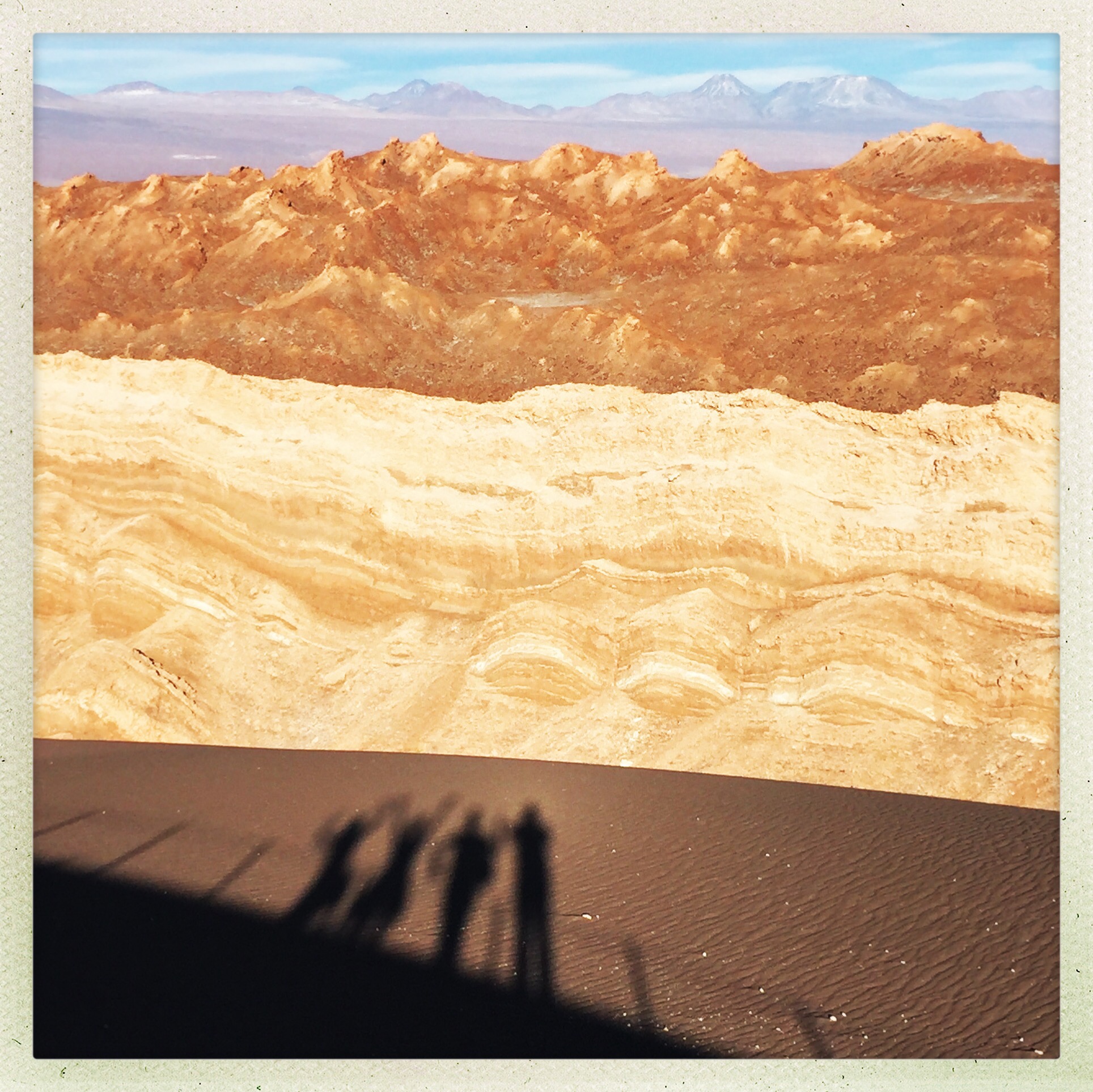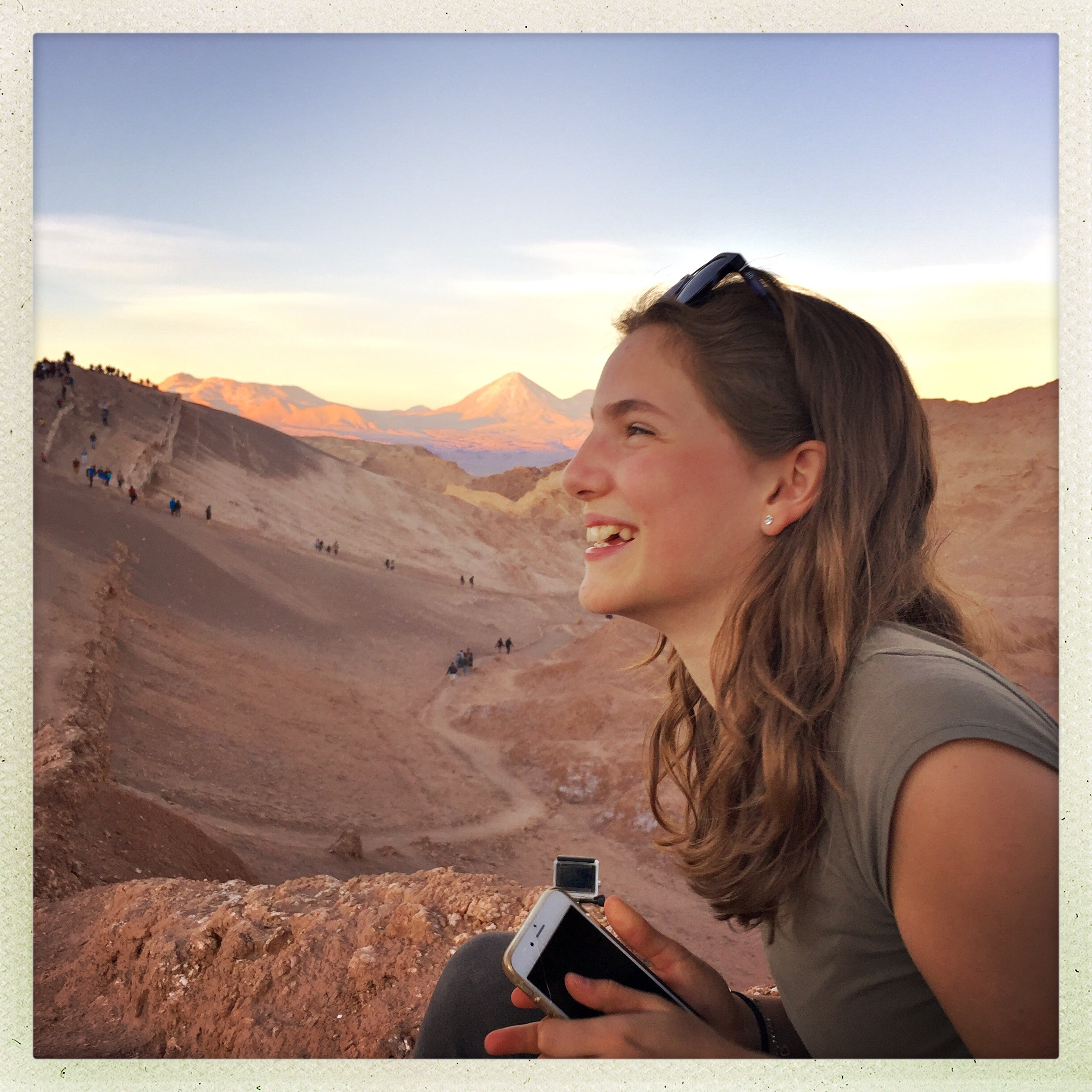 After lunch, we had a long bike ride through the Moon Valley. Throughout the ride, we saw mountains surrounding us from afar. After having bought our tickets into the park, we made our way through the bumpy and sandy road to the cavern. The whole cavern was made out of salt! After having inched through the dark tunnels, the very low ceiling and climbed up and down the hill,  we mounted back onto our bikes. After that started the hardest bike ride of my life. We had to climb all the way up the hill whilst the ground was covered in sand. Not that dusty sand you can find on dirt roads but real beach sand. This meant that every time we pedaled, the wheel would turn without us moving forward. This was near impossible going up. I had to wait at the top because Sasha was whining. After some more biking, we walked up the dunes from which we had an amazing view. The big dune looked just like the ocean. After going back down, we took our bikes to the next part where we never arrived because Sasha’s bike broke down. We the hurried back up the previous dunes to catch the sunset which we missed part of. (see my time-lapse in 1min video). It quickly started to get dark so we left, wearing our headlamps to guide us through the night. Papa had the broken bike so once at the information booth, he waited for a car to pick him up. Whilst he did that, we rid off into the night. He ended up biking, ultimately being picked up by some nice people. During our ride under the stars, Sasha and I were very tired after the long day but pushed on. Once almost at the town of San Pedro de Atacama, we passed a bridge where we almost died! I am exaggerating of course but in the darkness, I hadn’t seen the concrete step which I just barely grazed. I was more afraid for Sasha who didn’t have a lamp but she just followed me, not seeing the step all together. After that, I was just thinking that it had been a close call when suddenly, I felt a strong jolt downward. I had just gone through a hole. I was not expecting that after the bridge but it was more fear than harm. Overall it was an amazing experience which I absolutely adored.