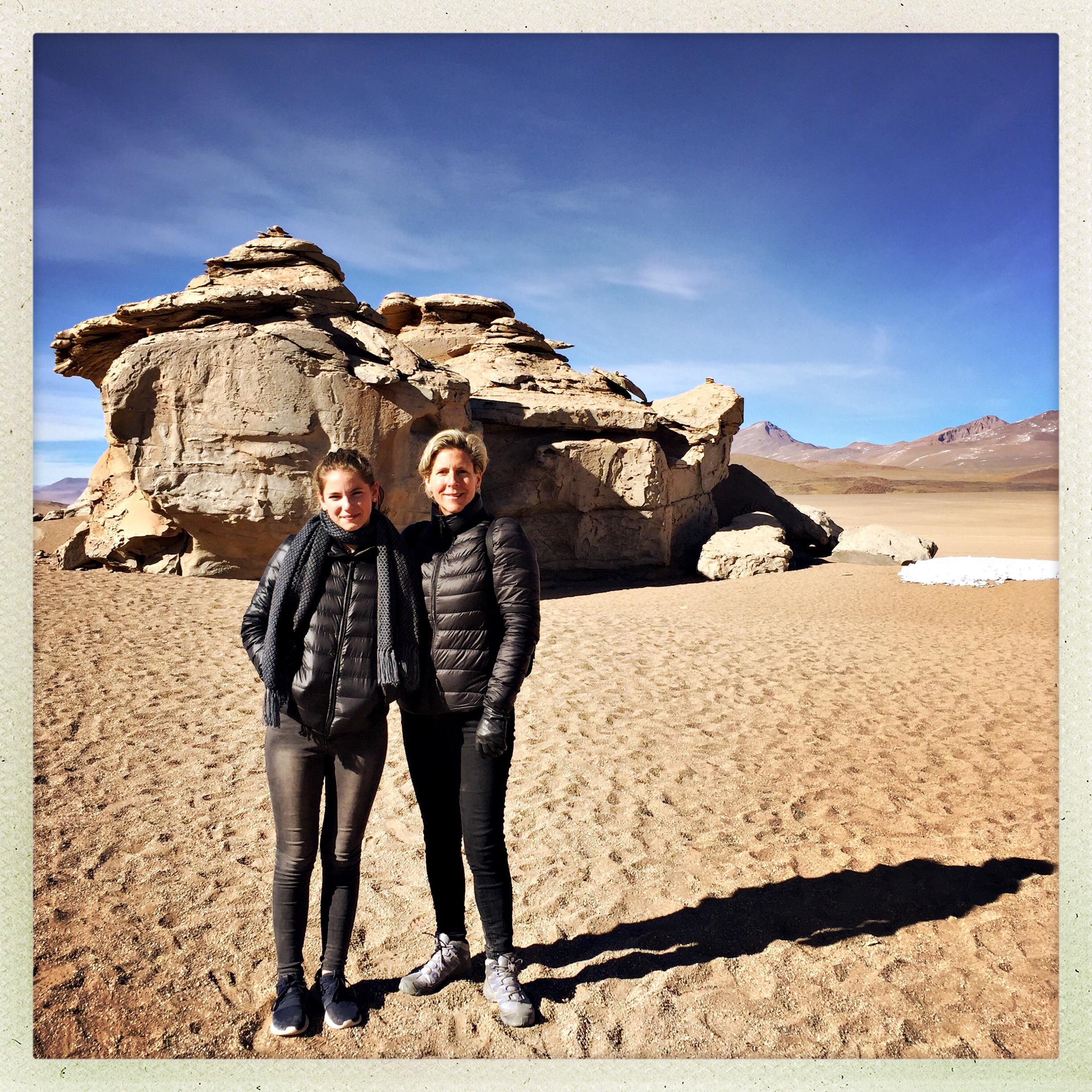 Nous sommes arrivés à un hotel de sel (très particulier) mais il y avait des douches.. Bon elle était froide mais ça faisait du bien de se laver! Le sol était fait de sel, les murs étaient fait de sel. Un diner sur des tables et chaises faites de sel. Et puis nous sommes sortis pour voir le coucher de soleil comme on dine à 18:30. 😂 Le ciel était rose.. C’était une très belle nuit avec plein d’étoiles!