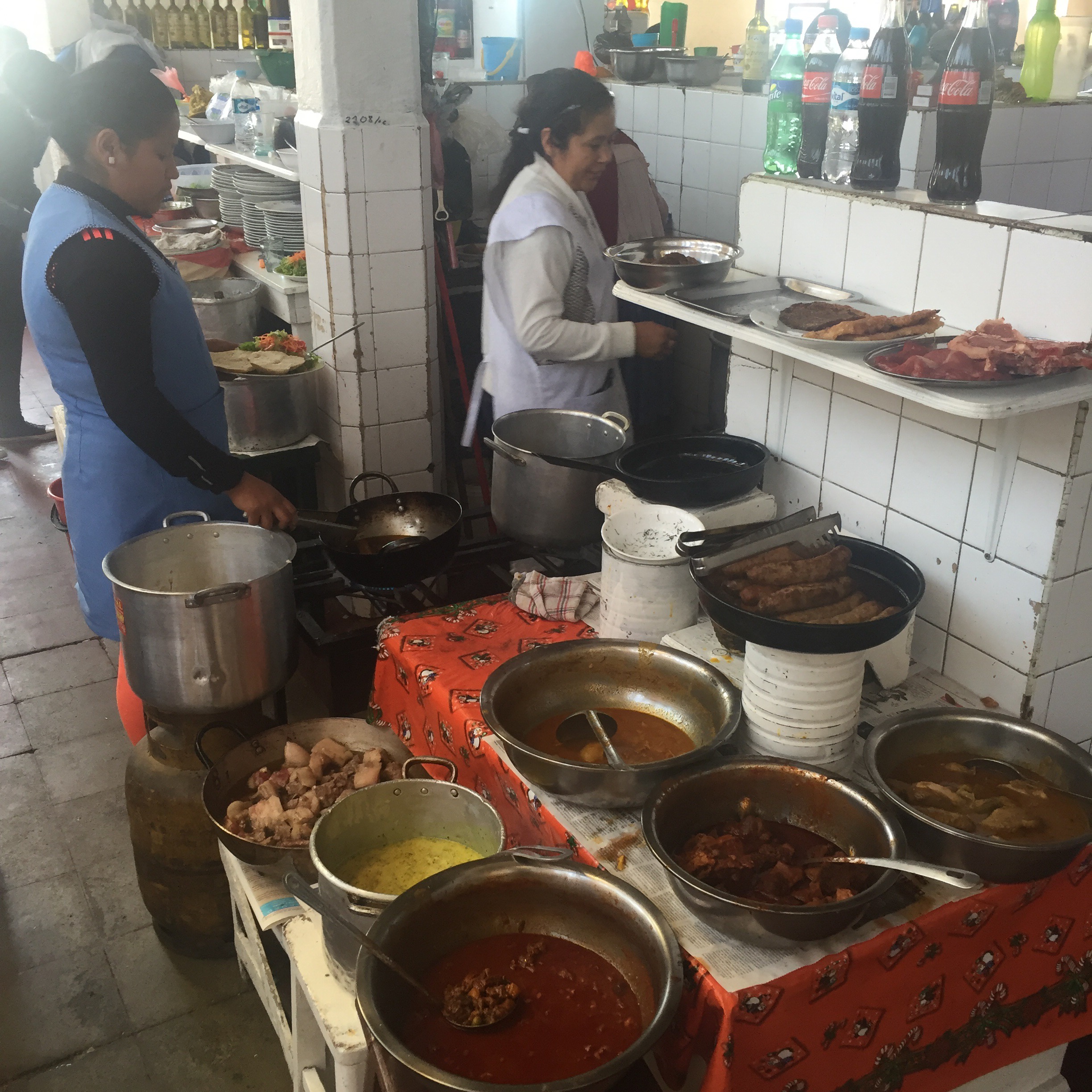 A l’étage du mercado central de Sucre sont alignées une foultitude d’échoppes tenues par des femmes et servant l’almuerzo (dejeuner). A la carte les plats typiques boliviens: choripan (saucisse sur du pain pimenté avec salade), sopa de pollo (soupe de poulet), chicharrones (morceaux de porc grillés en sauce avec le fameux chuño – pomme de terre déshydratée).