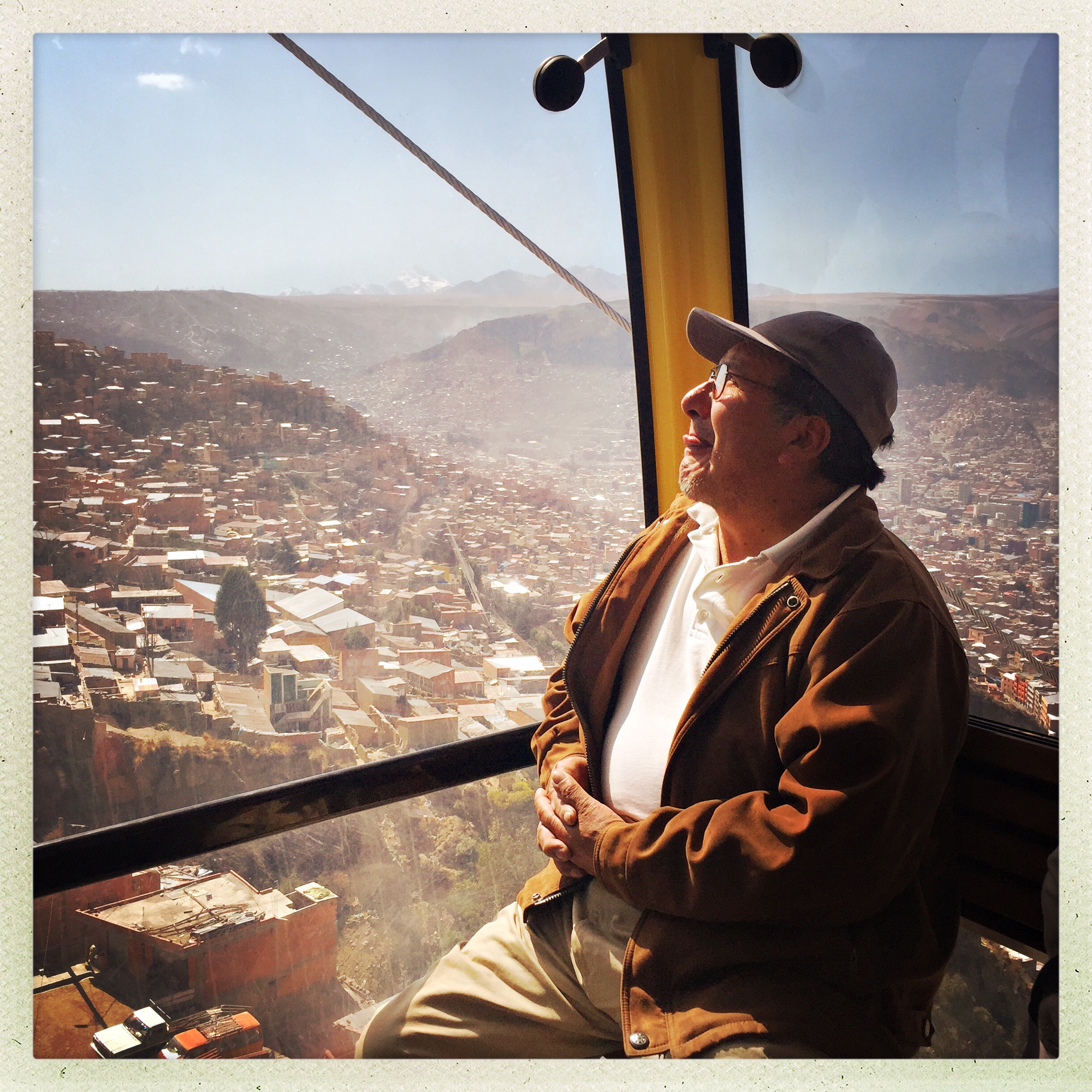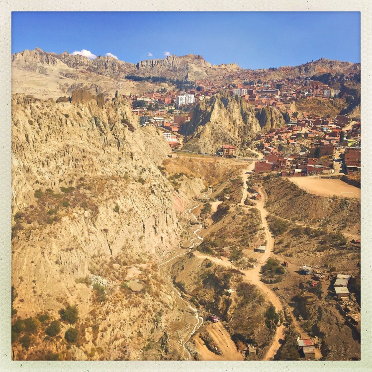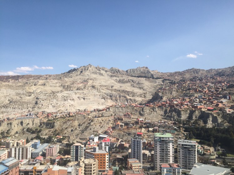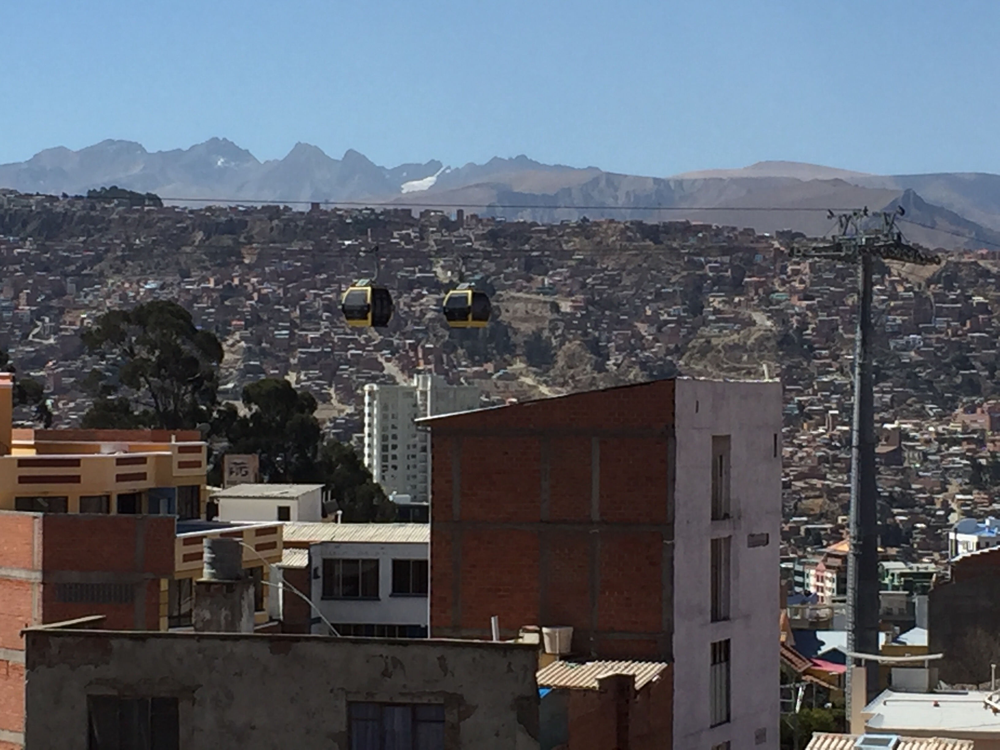 Everyone had had a good night’s sleep, the sun was streaming through the windows and our view of the teleferico, the brick buildings climbing uphill and the snowcapped mountains was almost surrealistic.