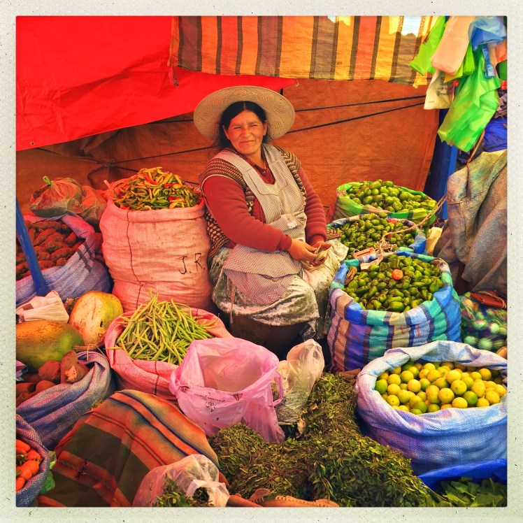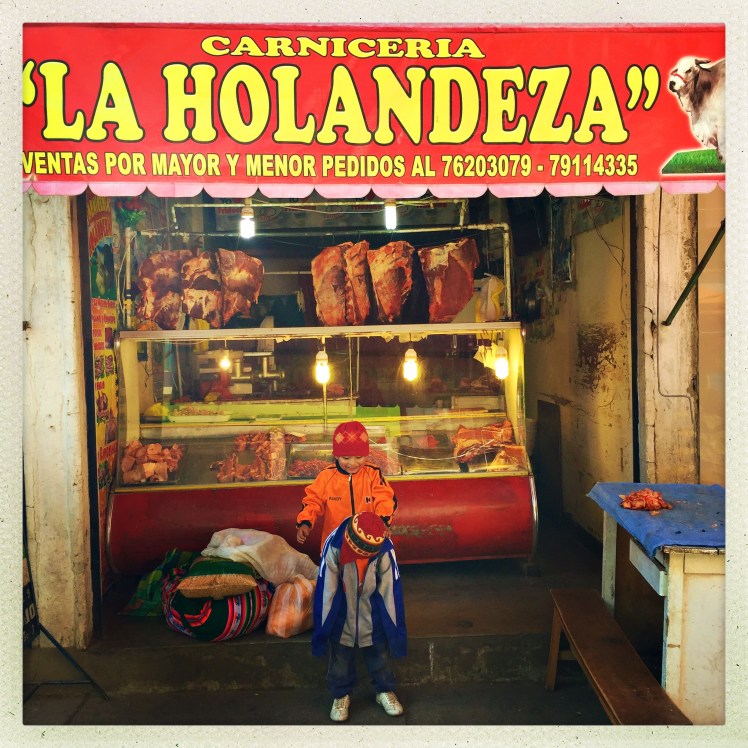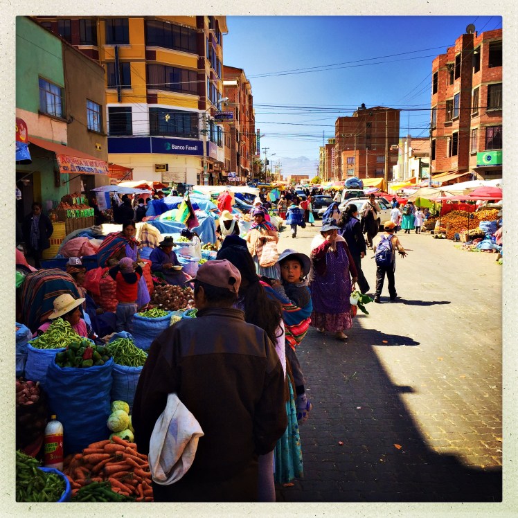Today we took the yellow teleferico up to El Alto (Bolivia’s second biggest city before La Paz which is third). The view over La Paz was incredible. We walked to the largest food market I have ever seen (apparently 15 city blocks) where we wandered from stall to stall and Alexis made friends with the lovely, diminutive, female vegetable vendors who giggled and grinned gold-toothed smiles as they saw our giant approaching.