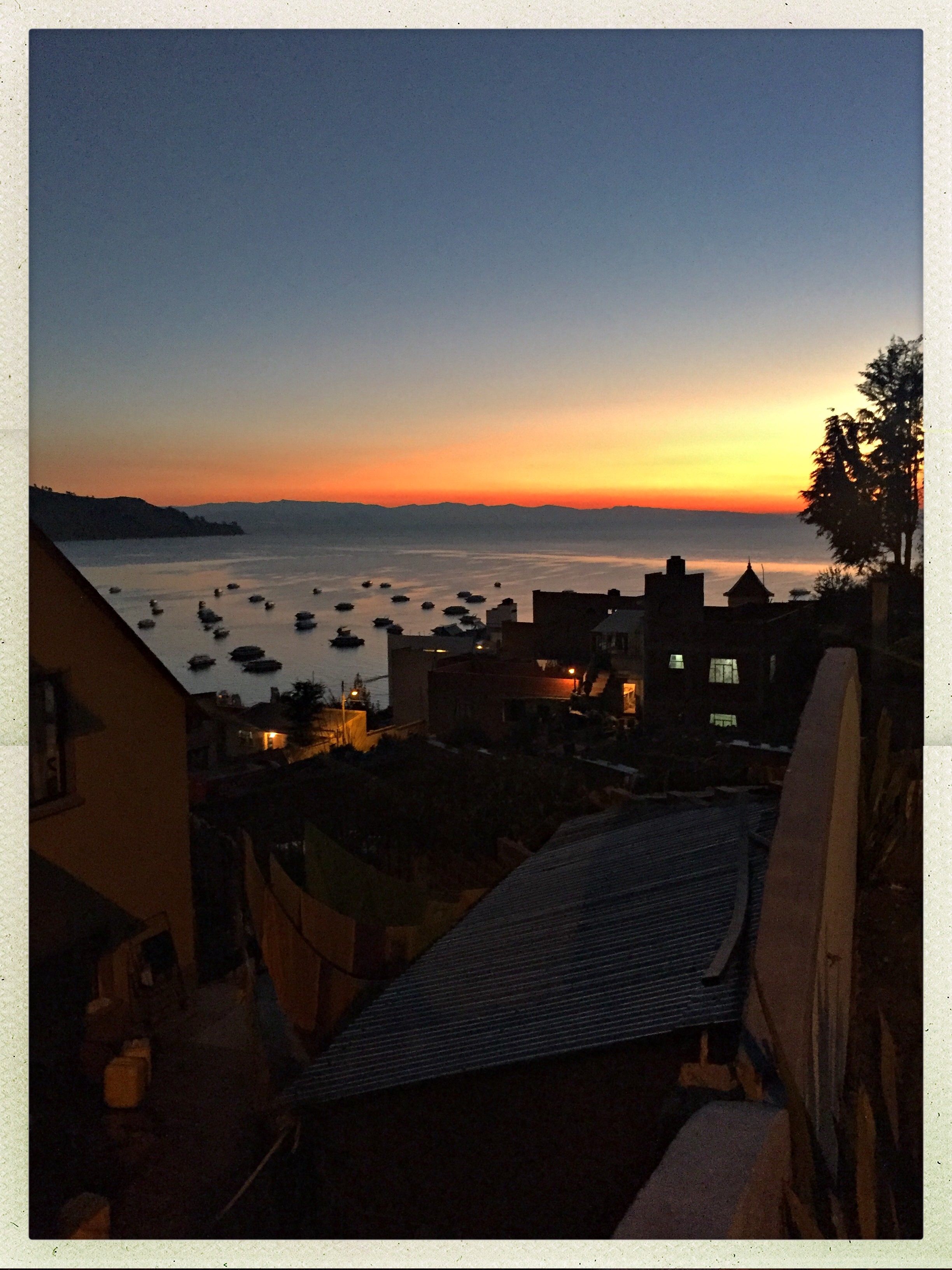 Coucher de soleil sur le lac depuis notre hotel. Après ça je me suis couché car l’altitude ne me réussit toujours pas (je vous ai dit que Titicaca est le lac le plus haut du monde à 3600 m?)