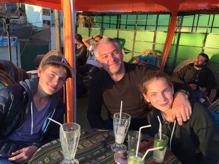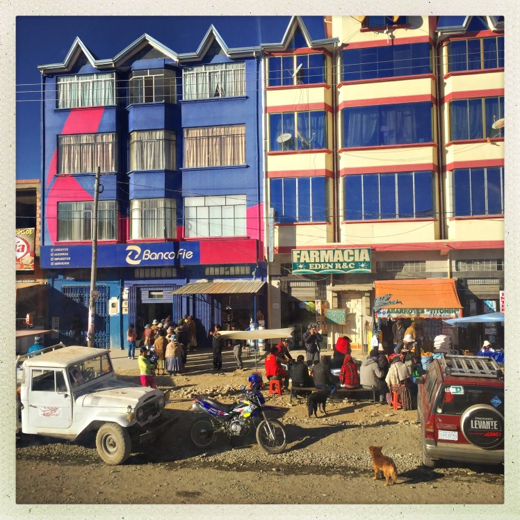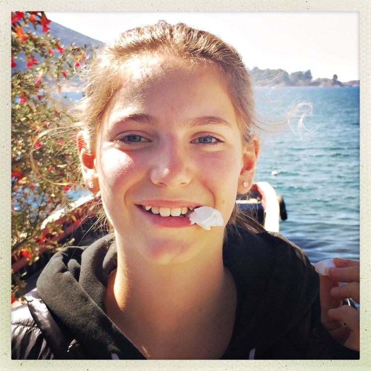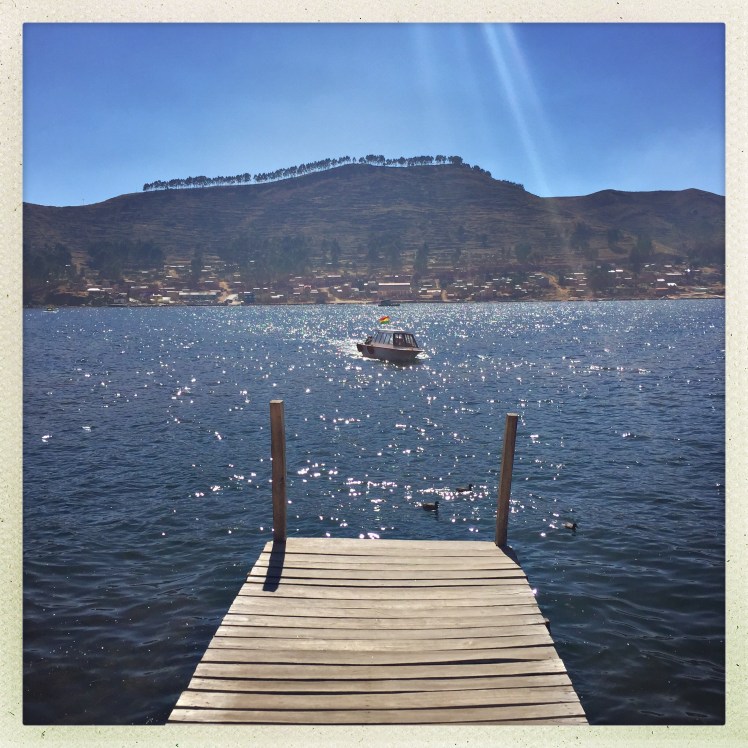 We woke up at 5:30am to catch the Bolivia Hop bus which would bring us to Copacabana (Bolivia not Brazil). Once at the rendez vous point, we waited for one hour before the bus arrived late. We could have slept an extra hour 😦 Once we got on, we relaxed and watched a movie during the 4h bus ride. We arrived at Copacabana where we dragged our luggage to our hotel which is on a hill overlooking the lake Titicaca. We had lunch outside at the hotel and then all took a nap, some inside, some in the hammocks in the pretty garden. We then walked down to the lake where we rented a paddle boat, which was very pleasant. We stopped for an aperitif on a rooftop bar overlooking the sunset on the water. It was magnificent. So many colors: blue, red, yellow, orange…
