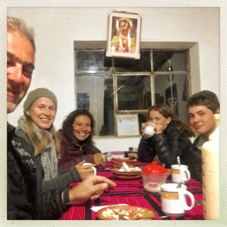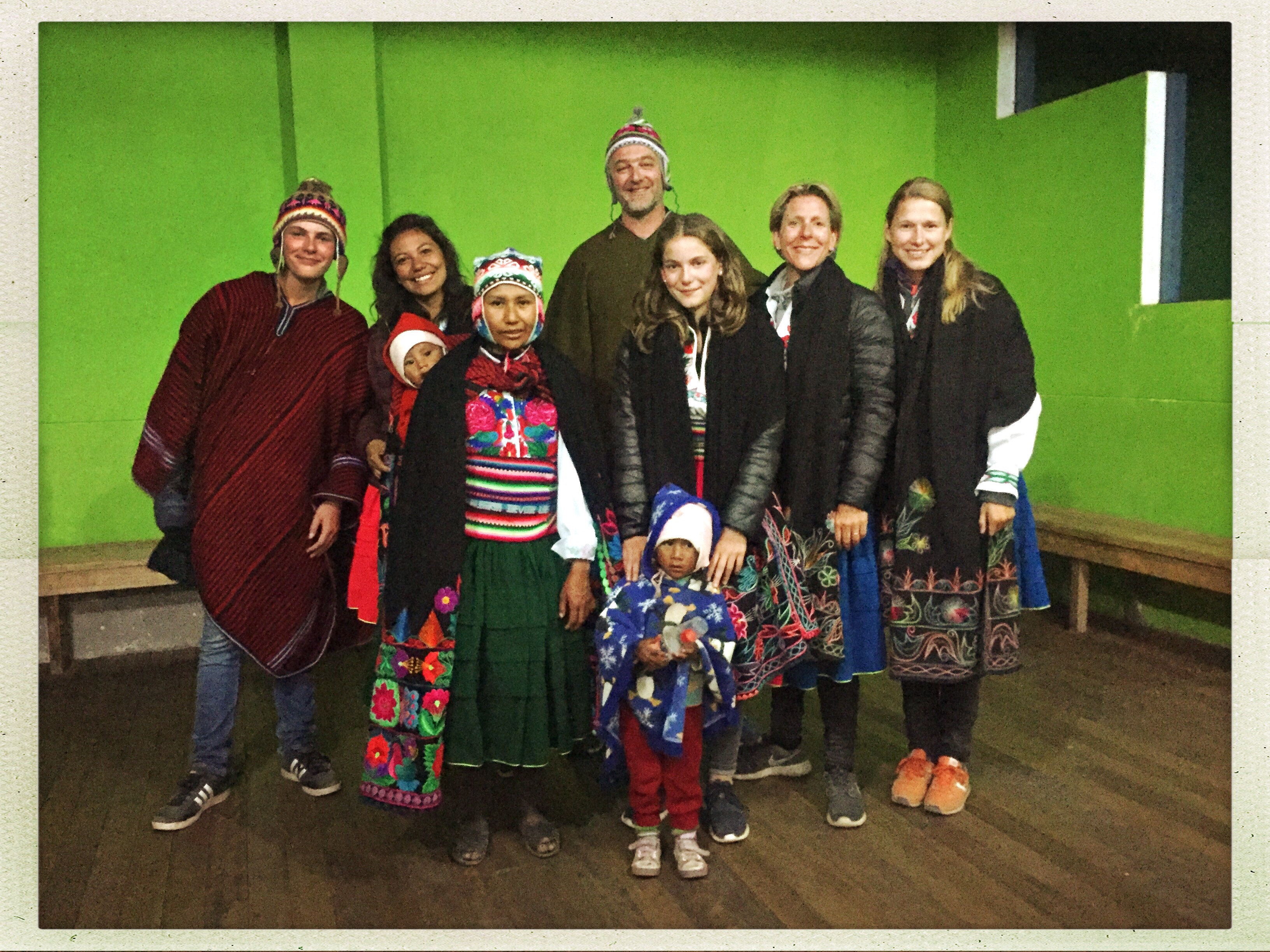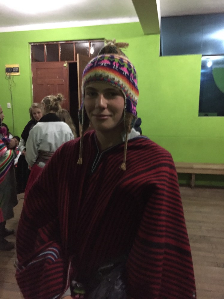 Puis nous sommes redescendus dans le noir (avec nos lampes frontales) et nous sommes rentrés chez Vilma pour dîner. Un autre repas typique, (une soupe avec des pommes de terre et des carottes et puis du riz et encore des pommes de terres et des carottes). Après le dîner on s’est déguisé avec des habits typiques, (une jupe colorée, une chemise blanche, une ceinture très serrée, et un châle noir). Et hop partis pour la fiesta. On a danser jusqu’à pas d’heure! Nan je rigole nous sommes rentrés après 2 danses. On était très fatigué et en plus réveil à 6h30. On s’est changé dans des habits chauds et puis au lit.