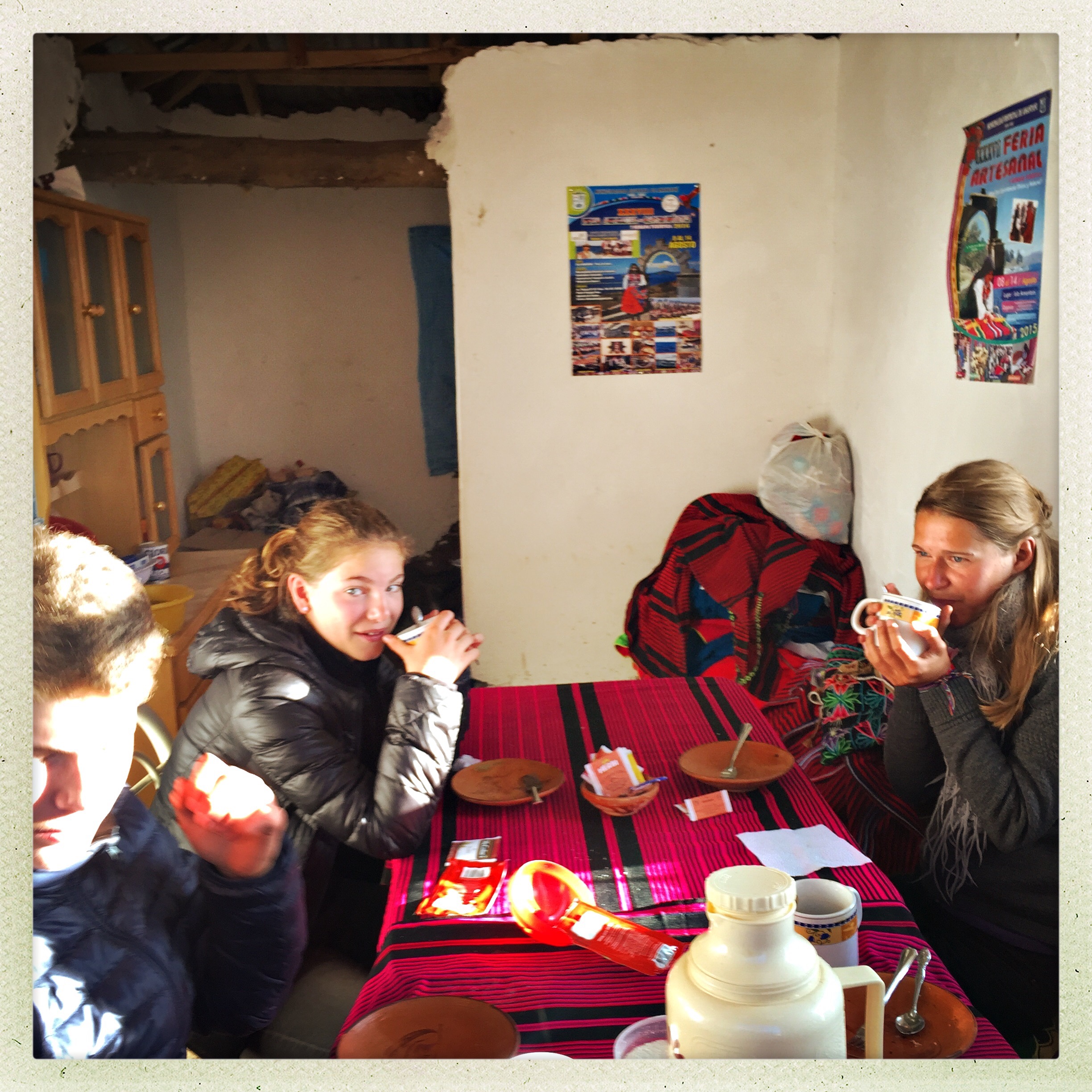 Après une nuit fraîche (sortir aux toilettes dehors à -5 trois fois dans la nuit fut assez challenging), nous voilà revigorés par les pancakes de Vilma et un mate de coca bien chaud. Dehors, toujours le soleil, compagnon indéfectible de notre voyage.