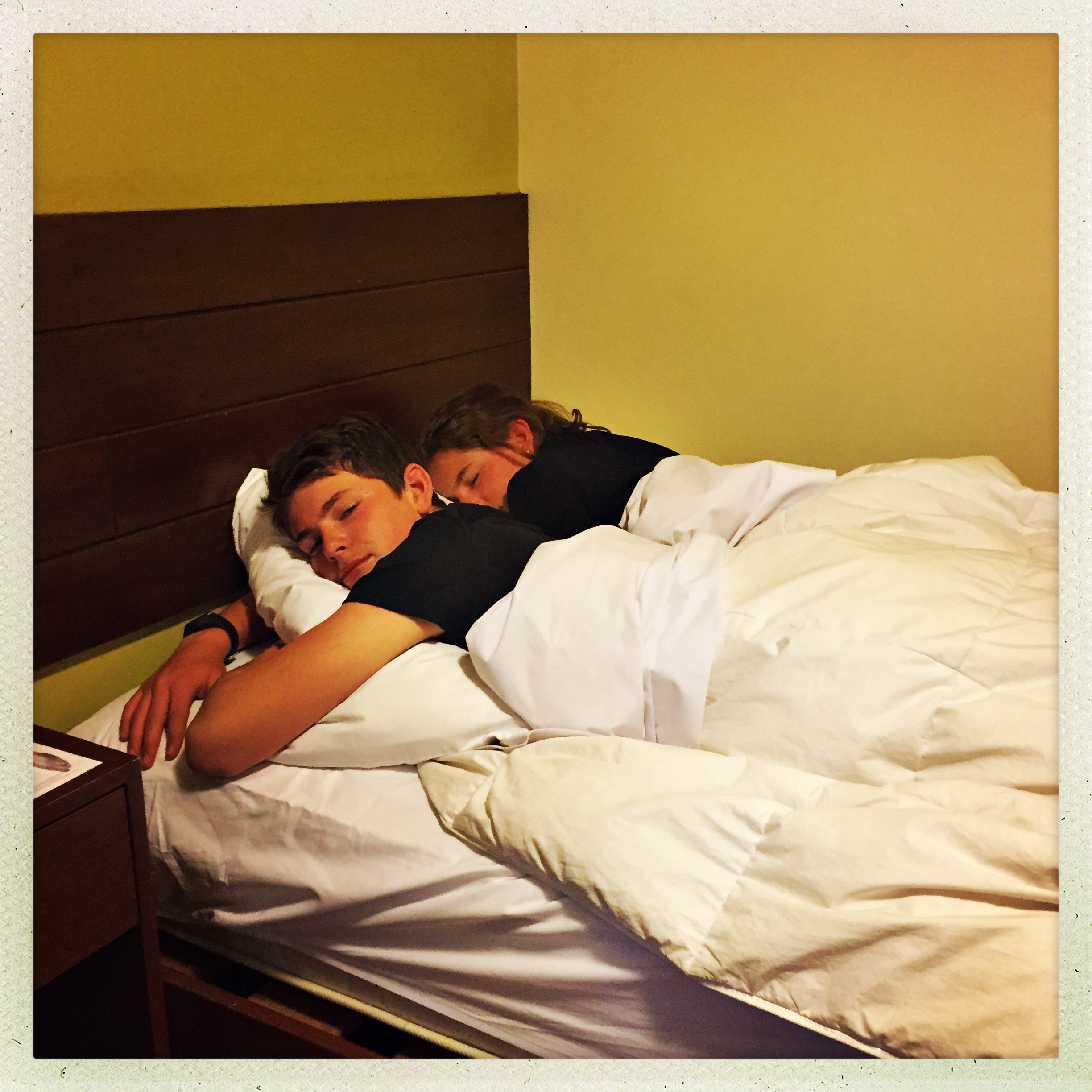 After our midnight transfer to a much less comfortable bus followed by five hours of terrifyingly dark, windy roads, we arrived in Arequipa at 5am. As the sun rose over the city, Peru Hop dropped passengers at their various hotels. We checked into Los Tambos just off of the beautiful main Plaza de Armas at 6am and they very thankfully were able to give us a room where we all crashed for three hours (see Alexis’ picture below 😊) making up for our previous two basically sleepless nights.