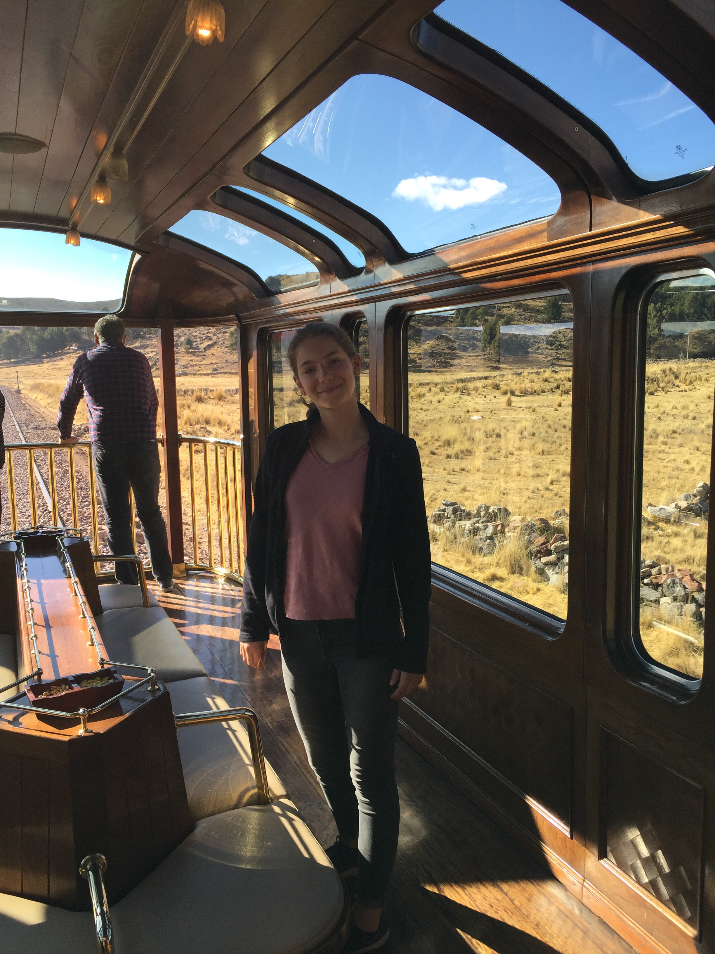 Ce train était magnifique. Un vieux train des années 20. Avec des paysages juste incroyables. Quand on y pense 10h c’est beaucoup mais pas quand tu es sur le Andean Explorer. Des petits shows ce déroulent pendant nos heures sur ce train. En premier un concert, et puis quelques heures plus tard un cours pour apprendre à faire un pisco sour ( dont Sam s’est rappelé du nom de l’alcool donc il a eu la boisson gratuitement ). Et après ca un petit fashion show de vêtements fait en bébé alpaca. Il y a aussi un service génial, et un déjeuner très bon! Il y a même un bar dans ce train. À côté du bar il y a un wagon fait en verre et au bout c’est ouvert sur la voie. C’est génial parce que ça nous permet d’avoir une vue encore mieu et de pouvoir prendre un verre. C’était très classe ce train et j’ai vraiment adoré! Une de mes activités préférée pendant le voyage. En plus il y avait un super « tea time ».