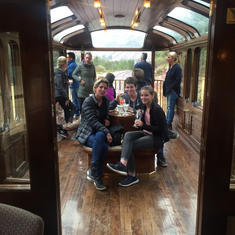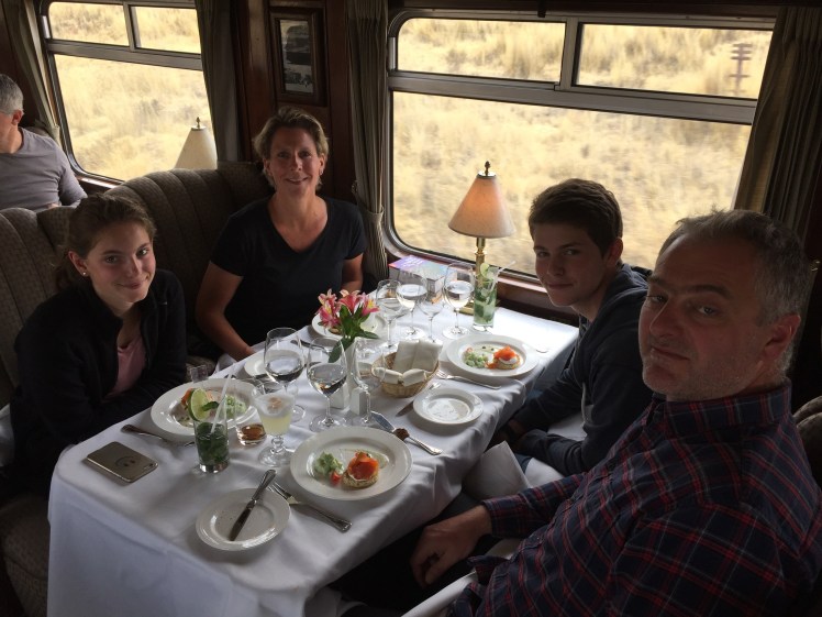 The big day had come and Alexis and I were very excited, knowing the kids would love this experience. However, as we arrived on time at the station, Sam announced that he had forgotten his jacket at the hotel! Major panic. Sam would definitely need his jacket, especially for the Inca Trail. Alexis decided to jump in a taxi to retrieve it. Needless to say, the stress level among the staff at the station (no need to mention my state!) when he was not back at 7:54 (for the 8am departure), was extremely high. But good ole Alexis rushed in at 7:56, hopped into our dining car with us, the train sounded its whistle and we were off.